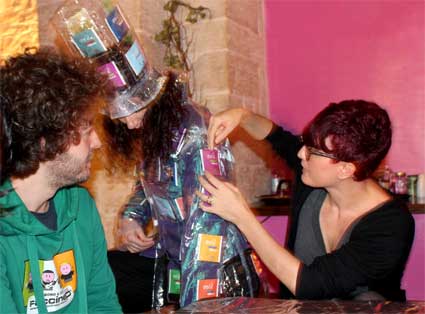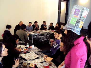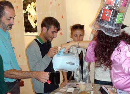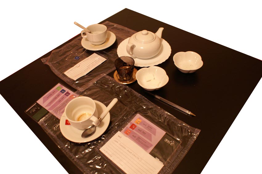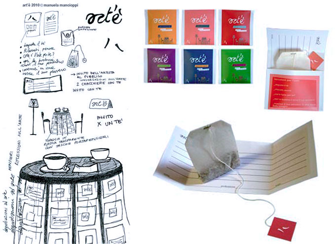 | Un invito al pubblico per una degustazione ad arte. Degustando un tè si invita a pensare e riflettere, individuare una frase esplicativa sul significato dell’arte. Cos’è l’arte per te? Art’è, appunto. Uno, più, tavoli dalle tovaglie trasparenti munite di tasche. Tasche contenitori di bustine di tè, si può scegliere il proprio gusto sul menù art’è, nel retro della bustina le istruzioni per l’uso, all’interno della bustina lo spazio necessario per scrivere la frase suscitata. Al termine della degustazione la bustina compilata va inserita in una tasca della tovaglia. | ||